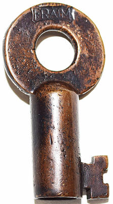 Lot: 281  Description: MK&TRY - (Missouri Kansas & Texas) block letters on brass switch key manufactured by Fraim. Dark patina on this short fat barrel key with deep stamping.
