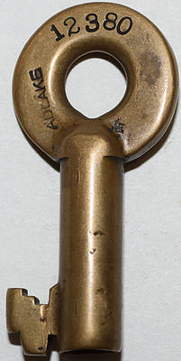 Lot: 290  Description: NYO&W - (New York Ontario & Western) block letters on brass switch key with serial No. 12380 on reverse. Manufactured by Adlake. Nice pocket worn example sure to please.
