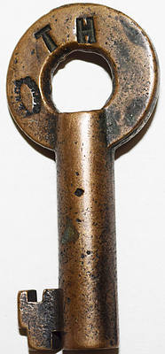 Lot: 299  Description: SANTA FE - block letters on brass key with TH (Tool House) on reverse. Manufactured by A&W shown in oval hallmark. Dark patina and even wear on this harder to find example.