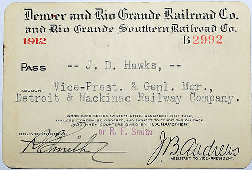 Lot: 446  Description: DENVER & RIO GRANDE RAILROAD CO and RIO GRANDE SOUTHERN RAILROAD CO - 1912 joint pass No. B2992 issued to J.D. Hawks, Vice-Prest. & Gen'l Mgr., Detroit & Mackinaw Railway Company. Light soil but still good display.
