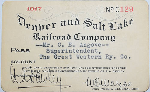 Lot: 447 Description: DENVER & SALT LAKE RAILROAD COMPANY - 1917 annual pass No. C129 issued to Mr. C.E. Angove, Superintendent The Great Western Ry Co. Black on tan with red highlights in good condition. Minimum bid: $20 Price Realized: $200 |