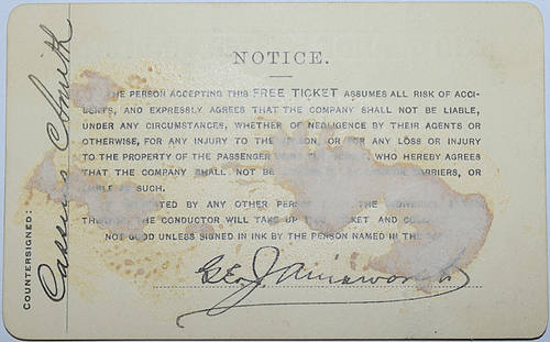 Lot: 465  Description: RIO GRANDE WESTERN RAILWAY - 1891 annual pass No. 1506 issued to Geo. J. Ainsworth Prest Redondo Railway Co. Black on gray with red highlights. Reverse shows glue residue with attached paper. Front is nice though and always desirable.
