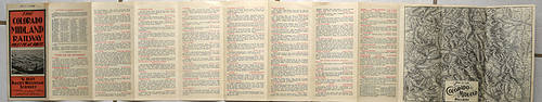 Lot: 482  Description: COLORADO MIDLAND RAILWAY - Pikes Peak Route 1897 12 panel accordion style advertising brochure that lists the destination and descriptions on one side and a panoramic view on the opposite with system map. Nice condition and harder to find.