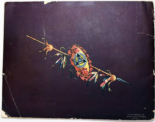 Lot: 483  Description: COLORADO MIDLAND RAILWAY - Scenic Colorado 24 page souvenir travel booklet with black & white photos of scenes along the line. Circa early 1900's this beautiful offering shows Indians on horseback chasing a wagon train and Pikes Peak logo on reverse. Cover has tattered edges on the spine but overall very acceptable.