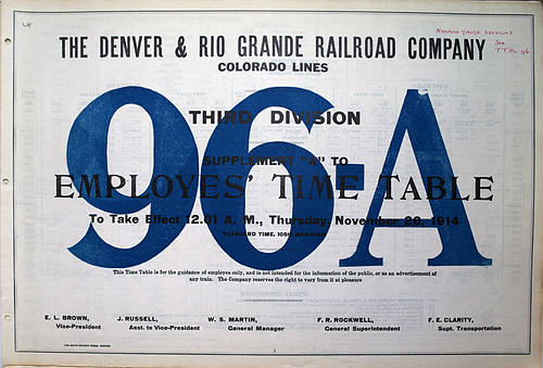 Lot: 487  Description: DENVER & RIO GRANDE RAILROAD COMPANY - employee time table No. 96 and 96 A third division dated November 29, 1914. Shows all the narrow-gauge divisions and in excellent condition.