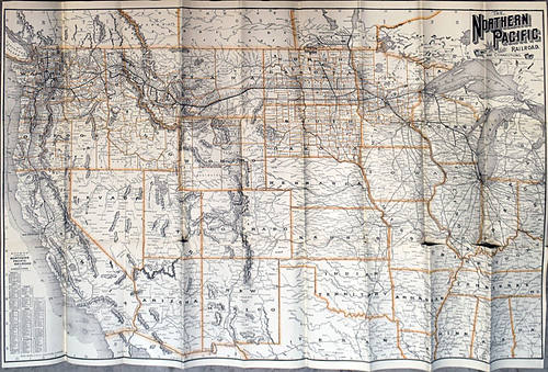 Lot: 498  Description: NORTHERN PACIFIC RR - "The Dining Car Line to Montana and the Pacific Coast," accordion style time table brochure with schedules and advertising dated 1892. 27 folded panels that open to reveal system map. Folds are brittle but an early and rare example sure to please.