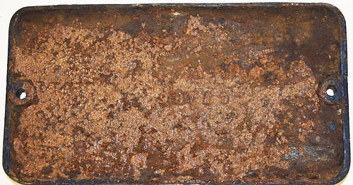Lot: 79  Description: WABASH RR - American Locomotive Company plate no.66158 Schenectady Works dated February 1925. Off of a 2-8-2 engine No. 2600. Cast iron plate measures 14" x 7 1/2" with old blue paint. Reverse shows heavy scale and rust. Embossed numbers are illegible. Still a nice offering.