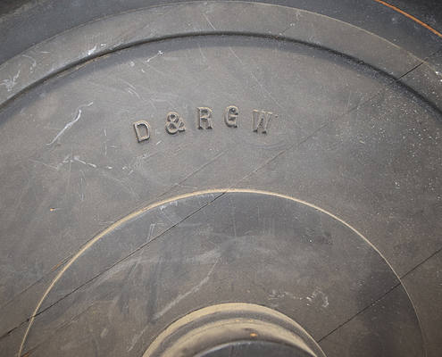 Lot: 94  Description: D&RGW - applied letters on large wooden pattern No. 14632. Pattern is for a Spur Gear used on the narrow-gauge pile driver “OB” at Alamosa. OB is now owned by the C&TS and was returned to operational condition a couple of years ago. Measures 31” diameter and 4” deep. A unique and maybe one of kind survivor for the Rio Grande enthusiast.