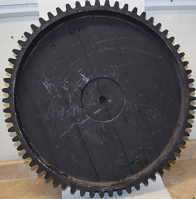 Lot: 94  Description: D&RGW - applied letters on large wooden pattern No. 14632. Pattern is for a Spur Gear used on the narrow-gauge pile driver “OB” at Alamosa. OB is now owned by the C&TS and was returned to operational condition a couple of years ago. Measures 31” diameter and 4” deep. A unique and maybe one of kind survivor for the Rio Grande enthusiast.