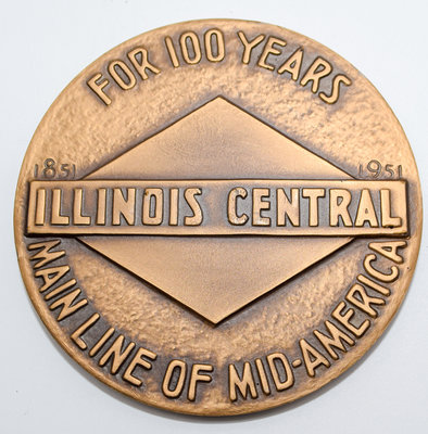 Lot: 10 Description: ILLINOIS CENTRAL PAPER WEIGHT - Commemorative brass paper weight issued for the 100th anniversary of the line in 1951 (founded in 1851). Design features embossed diamond logo in the center with Mainline of Mid-America below. Reverse image shows system map of the route. Measures 3" in diameter. Still housed in original presentation box. Minimum bid: $30 Price Realized: $60 |
