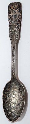 Lot: 14 Description: LEADVILLE, COLORADO SPOON - Sterling silver souvenir spoon featuring a mining scene on the bowl and front spoon handle. Front also reads "ROCKY MOUNTAINS". Back of spoon handle features beautiful design of the Leadville Ice Castle. Very unique piece displaying the history of this early Colorado mining town. Minimum bid: $40 Price Realized: Not sold |
