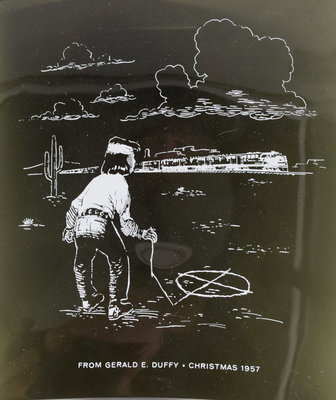 Lot: 16 Description: SANTA FE ASHTRAY- Glass souvenir ashtray by Gerald E. Duffy, dated Christmas 1957. Design features streamlined passenger train with Chico drawing in the sand. Measures 6 7/8" x 6 7/8". Small flake chip on one side. Otherwise, good used condition. Minimum bid: $10 Price Realized: $35 |