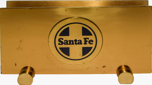Lot: 18 Description: SANTA FE NAPKIN HOLDER - Brass souvenir napkin holder features raised Santa Fe logo in center on the front side. Most likely an employee safety award. Measures 6" x 3" x 1". Good used condition. Minimum bid: $10 Price Realized: $320 |