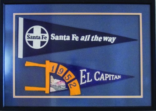 Lot: 19 Description: SANTA FE PENNANTS - Framed display features two Santa Fe pennants. The first design shows white Santa Fe cross logo with "Santa Fe all the way" on dark blue background. The second pennant design features the El Capitan train travelling through scenery with yellow and blue "1952" in arched design over the train. Very rare advertising items that are beautifully displayed in a matted frame. Measures 21 7/8" x 30 1/2". Please note this item requires special packaging in order to be shipped safely so the buyer will incur additional costs. Minimum bid: $100 Price Realized: $100 |