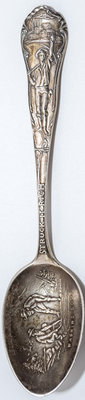 Lot: 2 Description: BOULDER, COLO SPOON- Sterling silver souvenir spoon titled "STRUCK IT RICH". Bowl of the spoon depicts two miners panning for gold. Reverse side handle shows a burrow on the top section with a horse-drawn wagon below. Spoon is dated 12/1/1903. Minimum bid: $20 Price Realized: $20 |
