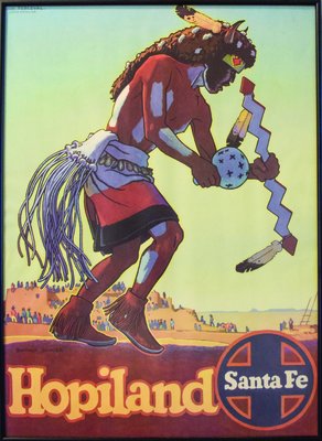 Lot: 22 Description: SANTA FE POSTER - Framed poster features Hopi Native American "Buffalo Dancer" with village onlookers in the background. Design by Don Perceval/Loma Hongna. Measures 16" x 22" in frame. Minimum bid: $50 Price Realized: $210 |