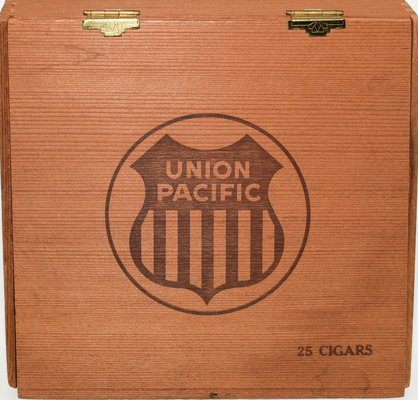Lot: 24 Description: UNION PACIFIC CIGAR BOX- Wooden box with modern UP Shield logo on the lid. Colorful label attached on underside. Held 25 cigars from the House of Windsor. Good used condition measures 7" x 7 1/2" x 1 3/8". Minimum bid: $20 Price Realized: $30 |