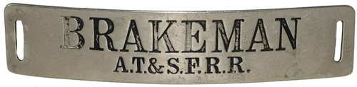 Lot: 25 Description: AT&SFRR BRAKEMAN - (Atchison Topeka & Santa Fe) black enameled letters on nickel rectangular cap badge with slotted ends. Enamel is worn but still an early badge. Minimum bid: $20 Price Realized: $50 |