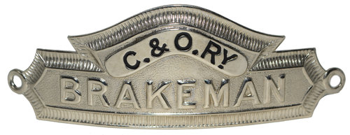 Lot: 27 Description: C&ORY BRAKEMAN - (Chesapeake & Ohio) black enameled letters over raised "Brakeman" on nickel plated crown-style badge. Loops on either side for brad attachment. No manufacturer's mark. In good condition. Minimum bid: $50 Price Realized: $55 |