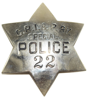 Lot: 28 Description: CRI&PRY SPECIAL POLICE- (Chicago Rock Island & Pacific) black enameled lettering on nickel plated "pie-plate" badge with saddle pin attachment on reverse. Badge No. 22. Enamel is worn and no manufacturer's mark shown. Still an early, harder to find badge. Minimum bid: $100 Price Realized: $220 |