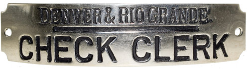Lot: 32 Description: DENVER & RIO GRANDE CHECK CLERK - black enameled letters on nickel rectangular cap badge with holes on either side for brad attachment. Hallmarked Denver Novelty Works & Mfg. Co. 1520 Lawrence St. Another rare and seldom found occupation that will be a welcome addition to any badge collection and ready to display. Minimum bid: $200 Price Realized: $725 |