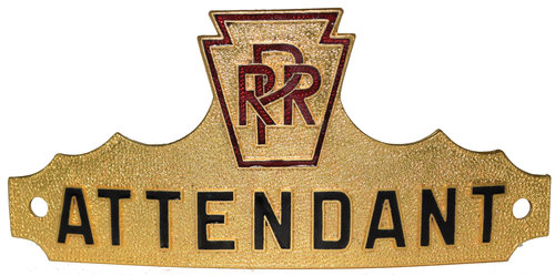Lot: 38 Description: PRR ATTENDANT (Pennsylvania) brass pebbled finish cap badge with holes on either side for brad attachment. Red & black inlay with Keystone logo top center. Hallmarked "The Wallace Co. Prov. RI", in excellent condition. Minimum bid: $75 Price Realized: $120 |
