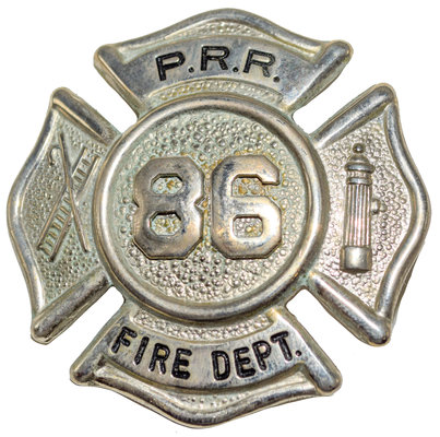 Lot: 42 Description: PRR FIRE DEPT 86 (Pennsylvania) black enameled letters on nickel badge with small burgess catch on reverse. No hallmark shown. Badge measures approximately 2 1/8" x 2 1/8". Good used condition and always a welcome piece to add to any collection. Minimum bid: $100 Price Realized: $110 |