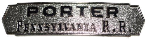 Lot: 45 Description: PENNSYLVANIA RR PORTER - black enameled letters on nickel rectangular badge with pebbled background and spread post attachments on reverse. Union hallmark on reverse and in ready to display condition. Minimum bid: $40 Price Realized: $55 |