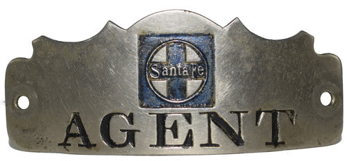 Lot: 49 Description: SANTA FE AGENT - nickel crown style badge with blue enameled cross logo over black enameled occupation. Logo enamel is worn and badge in used condition but still harder to find. Minimum bid: $40 Price Realized: $120 |