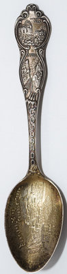 Lot: 5 Description: CRIPPLE CREEK, COLORADO SPOON - Sterling silver souvenir spoon depicts Portland Mine in bowl. Front of spoon handle shows images of Pikes Peak and Royal Gorge. Back of spoon handle features image of Balance Rock and Seven Falls. Minimum bid: $20 Price Realized: $20 |