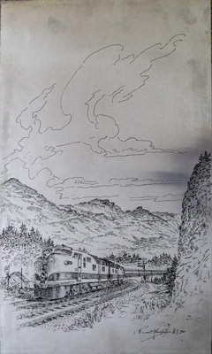 Lot: 9 Description: GREAT NORTHERN MURAL - Wall art design etched onto stainless steel by Vincent Maragliotta, NY 1950. He was a famous mural artist who died in 1978. The design features a Great Northern streamlined passenger travelling through the mountains. Measures 25”x15” and is mounted on a wood backing. This is one of four different designs that hung in the cars. A great piece of early railroad décor. Minimum bid: $100 Price Realized: $320 |