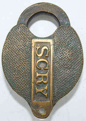 Lot: 406 Description: SCRY LOCK – embossed letters on panel of brass heart shaped lock with no manufactures marks shown but appears to be a Miller with the pebbled finish. It is possibly Southern California however, there are several possibilities, so I leave it up to the new owner. Minimum bid: $200 Price Realized: $1,250 |