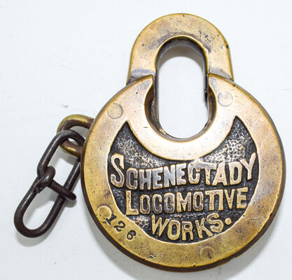 Lot: 407 Description: SCHENECTADY LOCOMOTIVE WORKS LOCK – embossed letters on body of brass six lever lock manufactured by Miller. Clevis hold one link of steel chain. Beautiful patina and harder to find. Minimum bid: $200 Price Realized: $875 |