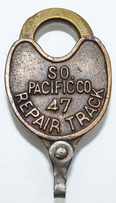 Lot: 410 Description: SO PACIFIC CO LOCK – embossed letters on body of #47 Repair Track brass heart shaped lock with steel clevis. No manufacturers marks shown. Good spring in the key cover but shackle is pretty loose. Dark patina and another welcome addition. Minimum bid: $100 Price Realized: $320 |