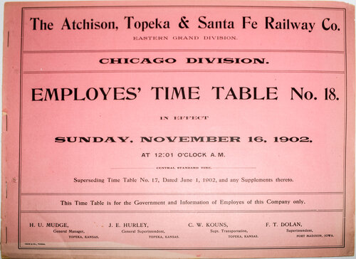 Lot: 415 Description: AT&SF EMPLOYEE TIMETABLE – No. 18 for the Chicago Division dated Sunday November 16, 1902. 18 pages in good used condition. Minimum bid: $20 Price Realized: $45 |