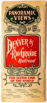 Lot: 426 Description: D&RG BROCHURE – February 1901 brochure with 14 two sided folded panels that open to reveal color etchings of scenes along the line along with descriptions of each. Folds are brittle but most intact. Minimum bid: $20 Price Realized: $35 |