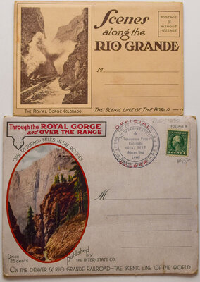 Lot: 427 Description: D&RG POSTCARD FOLDERS – lot includes two different versions of Scenes Along the Rio Grande. Both showing color photos in accordion style pullout. Nice condition. Minimum bid: $20 Price Realized: $20 |