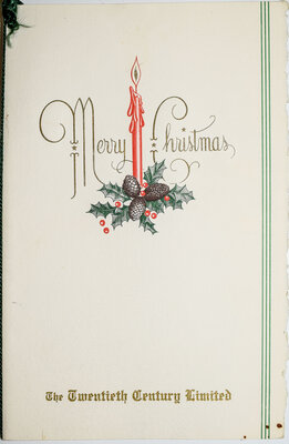 Lot: 434 Description: NYC MENU – Breakfast menu for the New York Central 20th Century Limited Christmas. Features Bacon Strips & Eggs or Kippered Herring with scrambled eggs. Nice condition measuring 10” x 6 ½”. Minimum bid: $20 Price Realized: $55 |