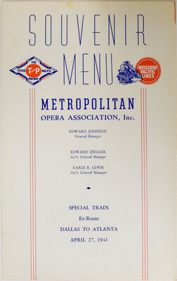 Lot: 445 Description: TEXAS & PACIFIC MENU – April 27, 1941, souvenir menu for the Metropolitan Opera Association. Special train En Route Dallas to Atlanta. Measures 9 ½” x 6 ¼”. Good used. Minimum bid: $20 Price Realized: $35 |