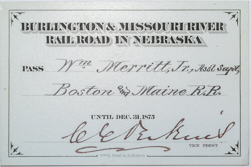 Lot: 457 Description: BURLINGTON & MISSOURI RIVER in NEBRASKA PASS – 1875 annual pass issued to Wm. Merritt Jr., Asst Supt. Boston & Maine Rr. Black on blue in nice condition. Minimum bid: $40 Price Realized: $40 |