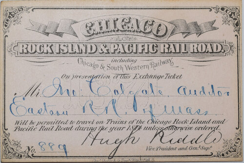 Lot: 458 Description: CHICAGO ROCK ISLAND & PACIFIC PASS – 1874 annual pass No. 889 issued to Thomas Colgate Auditor, Eastern RR. Black on pink with ornate lithography. Light foxing early offering. Minimum bid: $20 Price Realized: $20 |