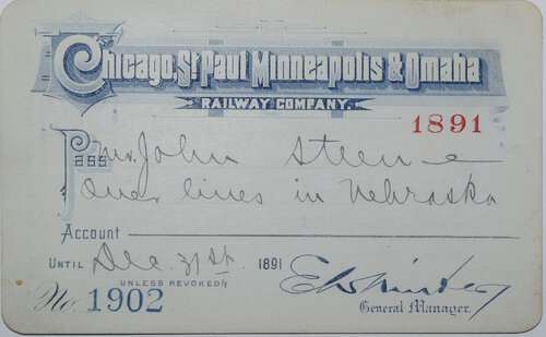 Lot: 459 Description: CHICAGO ST PAUL MINNEAPOLIS & OMAHA PASS – 1891 annual pass No. 1902 issue to John Sterns, Over Lines in Nebraska. Two tone blue with red highlights. Minimum bid: $20 Price Realized: $20 |