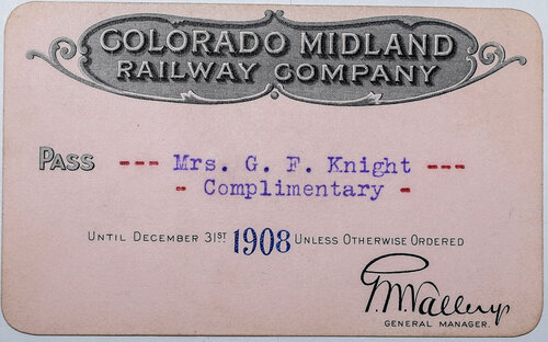 Lot: 463 Description: COLORADO MIDLAND PASS – 1908 annual pass No. A3462 issued to Mrs. G.F. Knight. Black on pink in good ready to display condition. Minimum bid: $50 Price Realized: $50 |