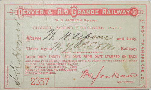 Lot: 466 Description: DENVER & RIO GRANDE RR PASS – 1886 Ticket Agents Special Pass issue to W.H Upson, Ticket agent NY&LE. Red on green with early intertwined logo shadowed in the background. Pass has unfortunately tear on the top edge. Still displays well. Minimum bid: $50 Price Realized: $65 |