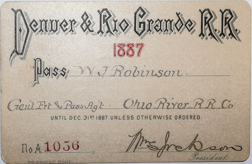 Lot: 467 Description: DENVER & RIO GRANDE RR PASS – 1887 annual pass No. A 1056 issued to W.J. Robinson, Gen’l Frt & Pass. Agt. Ohio River RR. Black on tan with red highlights. Light foxing and an early example and scarce pass ready to display. Minimum bid: $340 Price Realized: $675 |