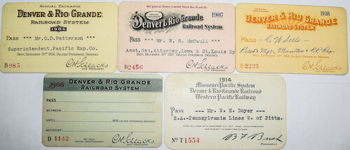 Lot: 471 Description: DENVER & RIO GRANDE PASSES – lot of 5 includes: 1906, 1907,1908, 1914 & 1908 unissued pass. All in good used condition. A nice lot that will be a welcome addition. Minimum bid: $100 Price Realized: $100 |