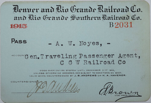 Lot: 473 Description: DENVER & RIO GRANDE/RIO GRANDE SOUTHERN PASS – 1915 annual pass No. B2031 issued to A.W. Noyes , Gen Traveling Passenger Agent, CGW Railroad Co. Black on blue with red highlights in good condition. Minimum bid: $40 Price Realized: $55 |