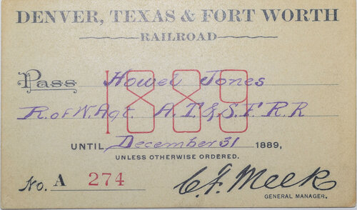 Lot: 474 Description: DENVER TEXAS & FORT WORTH PASS -1889 annual pass No. A274 issued to Howel Jones, R of W Agt. AT&SFRR. Black on tan with light foxing. Minimum bid: $20 Price Realized: $340 |