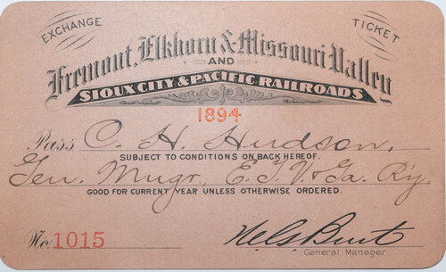 Lot: 476 Description: FREMONT ELKHORN & MISSOURI VALLEY PASS – 1894 annual pass No. 1015 issued to C.H. Hudson, Gen. Mgr. ETV&G Ry. Black on brown with red highlights in nice condition. Minimum bid: $40 Price Realized: $45 |
