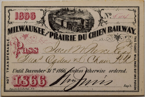 Lot: 481 Description: MILWAUKEE & PRAIRIE DU CHIEN RY PASS – 1886 annual pass No. 544 issued to Jacob W. Pierce, Esq. Treas., Ogdensburg & Lake Champlain RR. Black on white with red highlights and ornate vignette. Early and scarce. Minimum bid: $100 Price Realized: $210 |